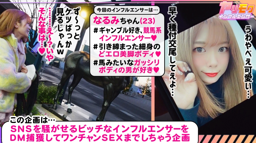 あらすじ:SNSを駆使してヤリまくるビッチなインフルエンサーをDMで捕獲して隙あらばワンチャンSEXまで狙う新時代プロジェクト!今回のヤリモクインフルエンサーは、なるみちゃん(23)ギャンブル好きの彼女の為に今回は某競馬場で待ち合わせ!モデル顔負けの足長スレンダーBODYなるみちゃんとインタビューをしながら競馬場で観光デート、ギャンブルに負けず劣らずセックスも大好きな彼女とノリノリでホテルへGO!なんと男が一人だけだと足りないようなのでもう一人絶倫兄貴を召喚したところ神展開突入!スタッフも巻き込み7発も射精!完全に搾り取られてしまいました…